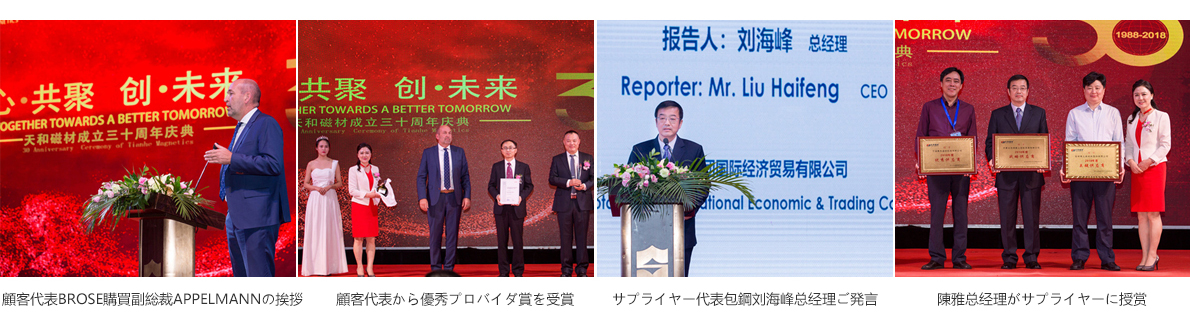 祝典には、天和磁材30周年祝典に出席いただいて御來賓の皆様方に対して熱烈な歓迎と衷心よりの感謝の意を心から表すると袁文杰董事長から挨拶しました。政府の支持、得意先及び供給會社からの信頼のおかげで、天和磁材はここまで発展しつづきました。三十年以來、天和磁材は信望が企業(yè)生存の基本と信じ、約束を守り、約束を果たすの原則を堅持しております。これからの未來にも、天和磁材は誠実重視、ユーザー至上という趣旨で、優(yōu)良な品質(zhì)で生存を求め、イノベーションで発展を探るとの方針で、業(yè)界リーダーとして、マグネットの前進(jìn)技術(shù)を開拓していきたいと思っています。工程技術(shù)と配合法を改善しつづ、管理システムの完備を強化します。品質(zhì)を保證する同時に、最大限度的コストダウンします。 皆様方と協(xié)力し合い、共に成長していくことを望んでいます。