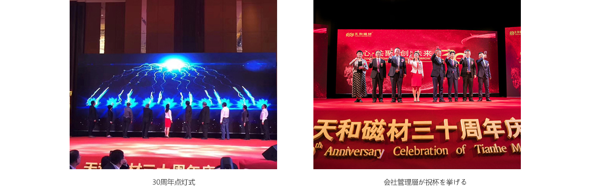 雨風(fēng)に負(fù)けず30年、支えてくれた政府の方々、顧客、サプライヤー、各界の友、そしてまじめに働く天和従業(yè)員に感謝します。総経理の陳雅は各界の代表と祝賀會の點燈式を開きます。會長の袁文杰は、會社管理層、株主代表を乾杯の音頭で天和磁材創(chuàng)立30周年を祝う。
