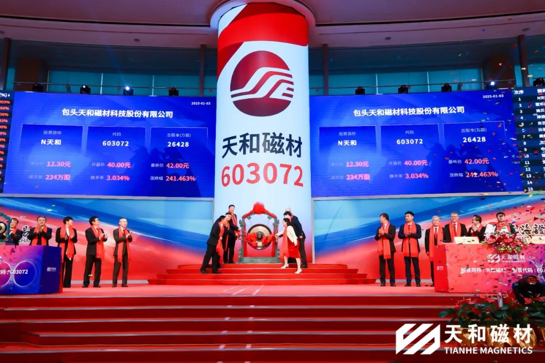 2025年1月3日,包頭天和磁材科技股份有限公司(股票代碼603072)正式在上海證券交易所主板上市,成為國內(nèi)主板資本市場新年首家成功上市的企業(yè)。內(nèi)蒙古自治區(qū)、包頭市及稀土高新區(qū)相關(guān)領(lǐng)導(dǎo)、重要股東、業(yè)務(wù)合作伙伴、中介機(jī)構(gòu)、天和磁材管理團(tuán)隊(duì)及員工代表共同見證了這一輝煌時(shí)刻。