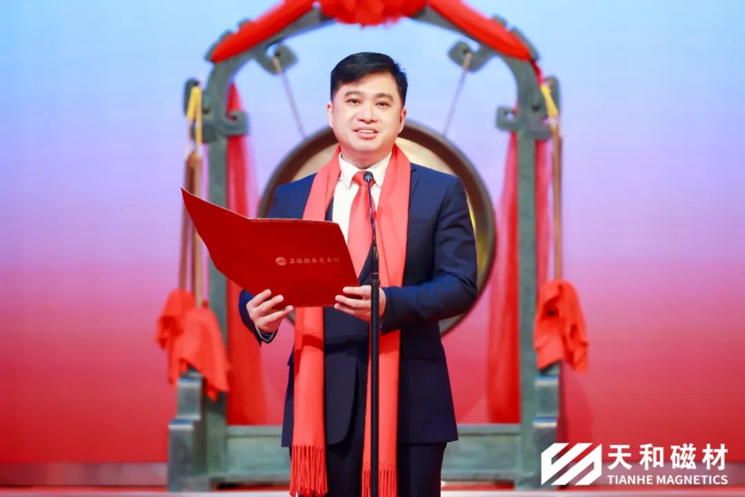 包頭天和磁材科技股份有限公司總經(jīng)理陳雅女士接受上海證券交易所副總經(jīng)理王泊先生贈送的開市祥鑼紀(jì)念品,預(yù)祝天和磁材開市大吉,鵬程萬里!