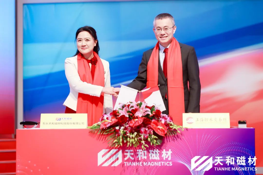 包頭天和磁材科技股份有限公司總經(jīng)理陳雅女士與上海證券交易所副總經(jīng)理王泊先生簽訂《證券上市協(xié)議》。
