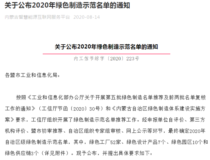 2020年工業(yè)和信息化部公示了“第五批綠色制造名單”,內(nèi)蒙古自治區(qū)公示了“綠色制造示范企業(yè)名單”,公司分別獲得國家級“綠色工廠”和自治區(qū)“綠色工廠”。
