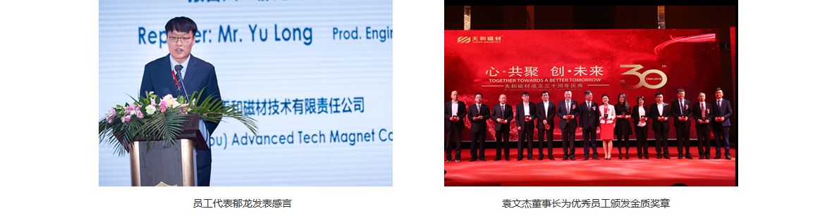 天和磁材發(fā)展至今,離不開全體員工的傳承與奉獻,離不開老員工的長期堅守和新員工的持續(xù)加盟。公司生產部工程師郁龍代表全體員工表達了心聲:為自己能夠在這樣一個銳意進取又溫馨舒適的大家庭中工作而倍感自豪!公司30年來積淀的企業(yè)文化深深地激勵著每一個員工,讓大家不斷地探索與追逐夢想。公司給予了員工平臺和機會,大家必將全力以赴,不負信任,讓公司“安全、奮斗、創(chuàng)新、誠信、責任”的核心價值觀傳承下去、發(fā)揚光大。同時,為了感謝貢獻卓越的優(yōu)秀員工,袁文杰董事長為他們頒發(fā)了代表最高榮譽的金質獎章,以資激勵。