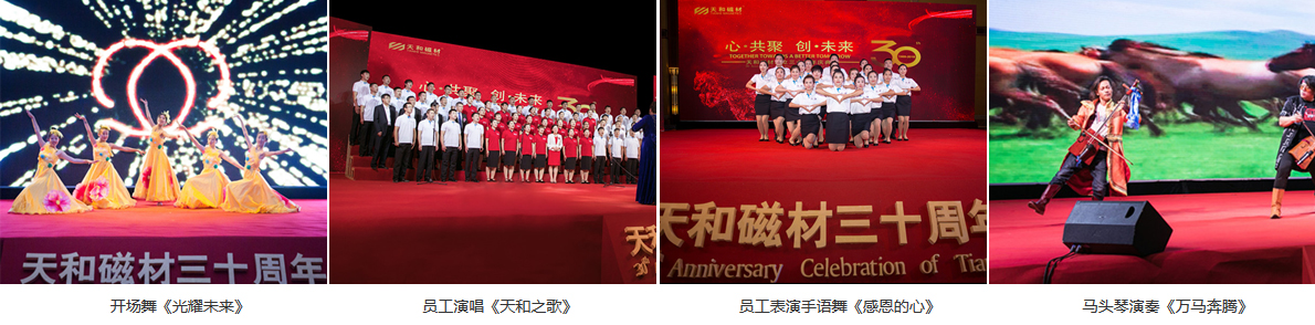 光影互動《光耀未來》拉開了慶典序幕,一首《天和之歌》將慶典儀式帶入了高潮,這是天和人獻給公司30周年的生日禮物,展示了天和人斗志昂揚的精神風貌。手語舞《感恩的心》更是表達了全體員工對公司的感恩之情、對公司深深的熱愛和美好的祝愿。氣勢宏偉的馬頭琴演奏《萬馬奔騰》預示著天和磁材正在飛奔跑向更加美好的未來。
