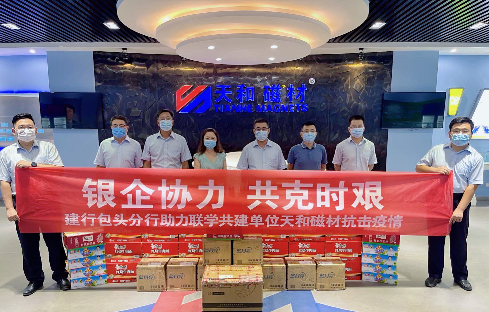 8月9日,建行包頭分行范瑞君行長、姜杰副行長攜團(tuán)隊一行克服重重困難蒞臨天和磁材,支援防疫物資,用愛心架起了疫情防控的橋梁,用實際行動彰顯了社會情懷和責(zé)任擔(dān)當(dāng),展現(xiàn)了建行與天和磁材攜手同行、眾志成城的大愛精神。